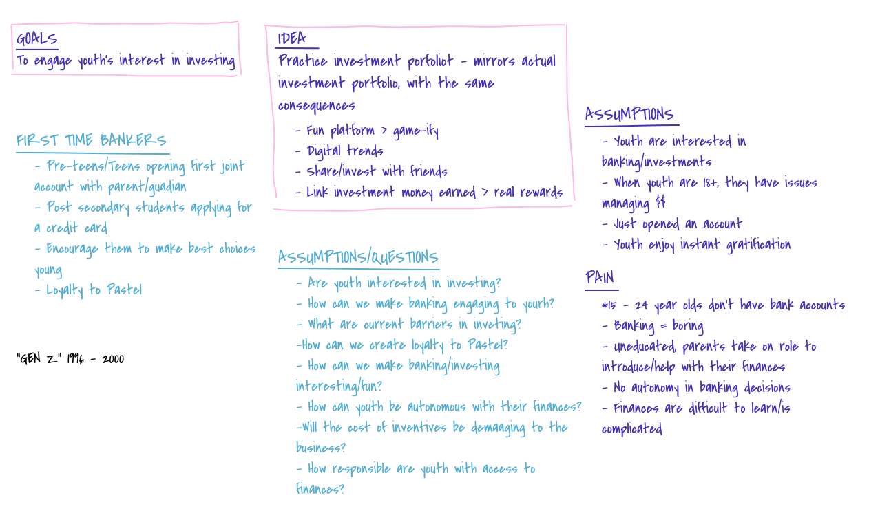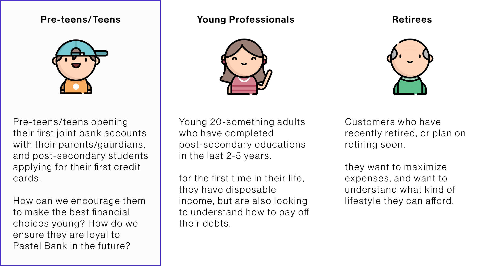 We want to create an environment where teens and youth feel cared for — investing in teens early on to understanding financial literacy will distinguish Pastel Bank from its competitors. Being friendly and approachable as a brand, as well as “putting customers first”, will allow teens and youth to empathize for the brand in the long run.