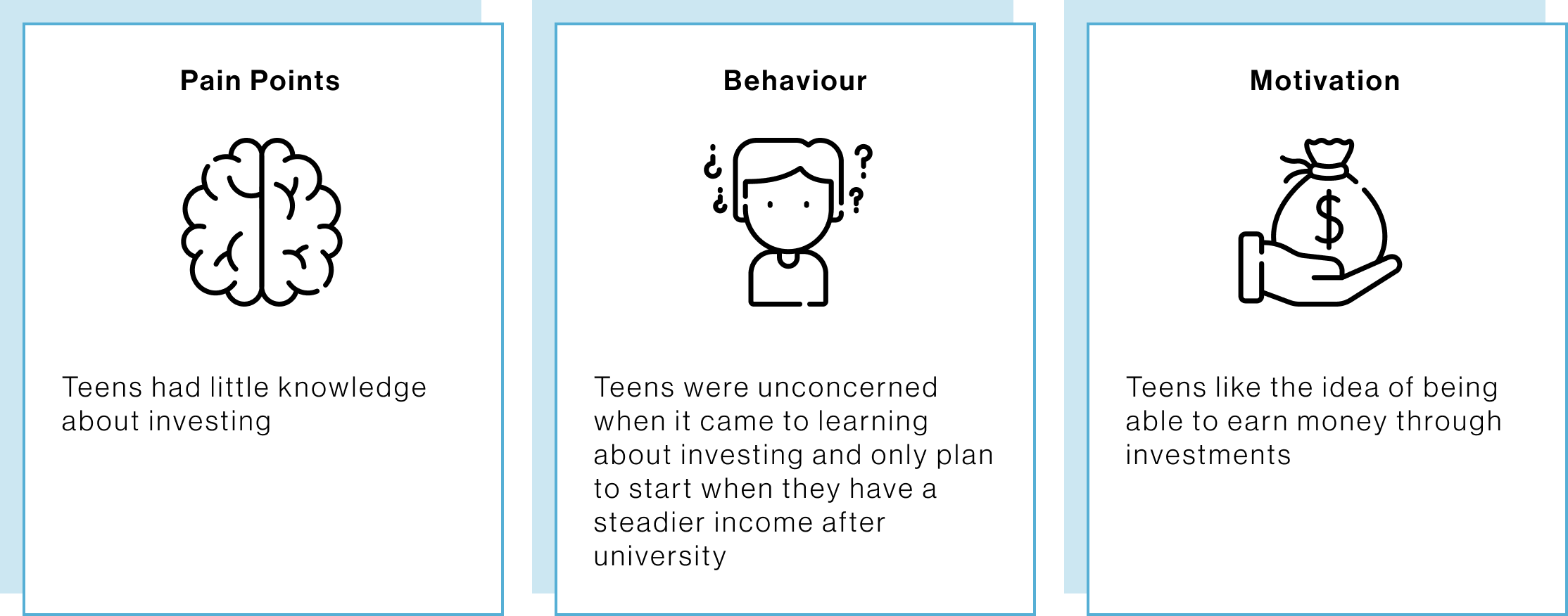 A Practice Investment Portfolio (PIP) linked to the user’s bank account. Pre-teens/teens can take this opportunity to learn about investing and earn real-life rewards. We wanted to engage youths’ interest in investing, so they can better prepare for their future. We believe that for Pastel Bank, targeting youths’ needs now will help enhance their intrinsic motivations to want to continue their services with our bank in the long run. Showing that you care about them while they’re young, will help build trust and empathy with the brand in the future.