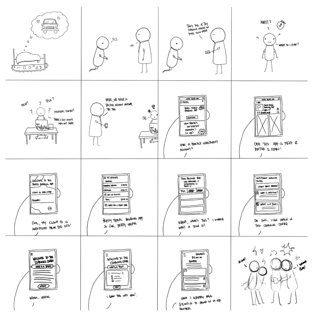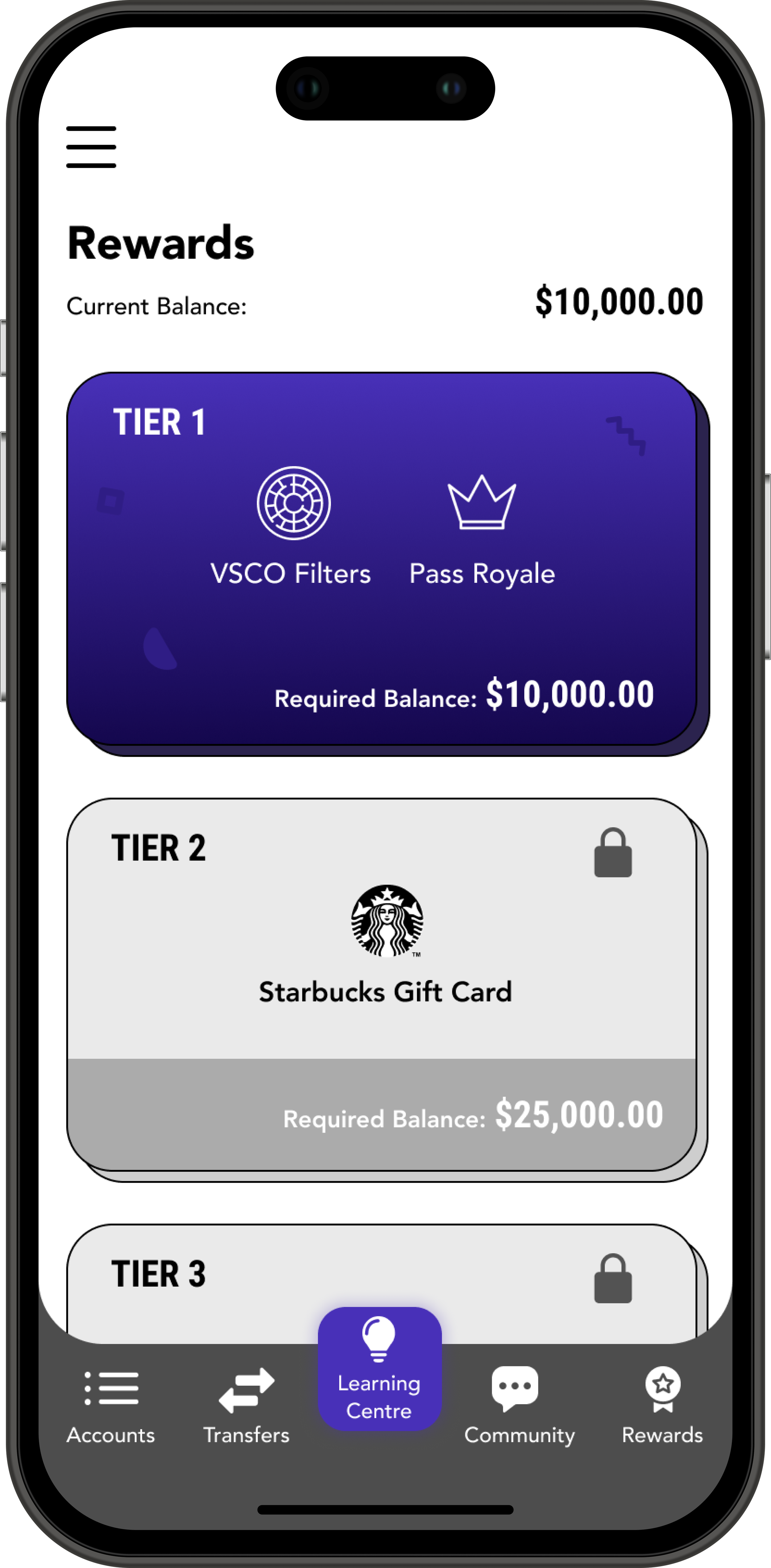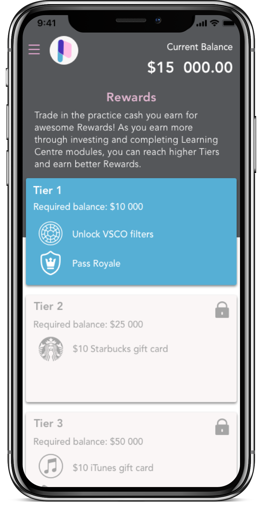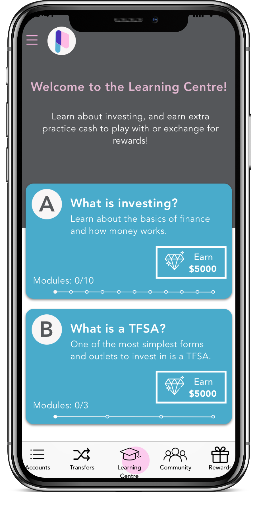 One of the business goals we wanted to achieve, was building a relationship with the youth to build loyalty towards Pastel Bank. The idea is that the PIP platform will be similar to the real Pastel Bank Investment platform. This will provide an easier transition when users have the capability to actually start investing. We would also like to offer a $300 investment reward earned by reaching the last Reward Tier on the Practice Investment Portfolio — this will go towards their Pastel Investment account, allowing the business to continue this relationship with the client into adulthood.