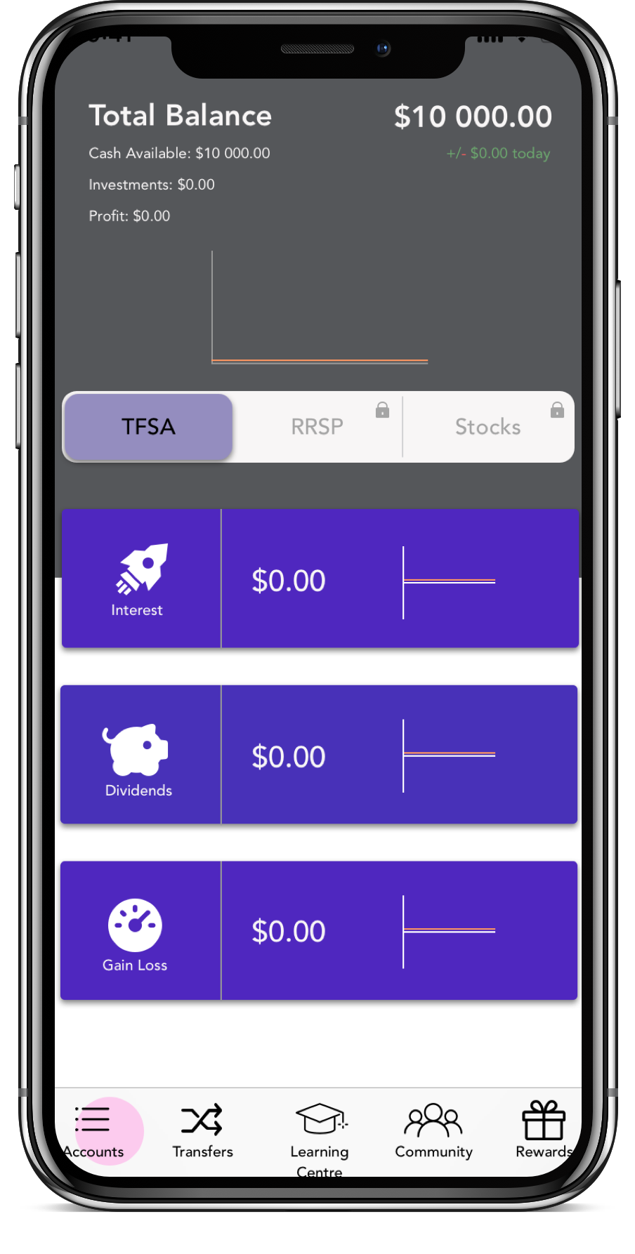 A collaborative academic design sprint with Scotiabank’s Digital Factory. My team and I designed a practice investment portfolio for teens to learn about investing, earn rewards, and further their ability to be financially independent.