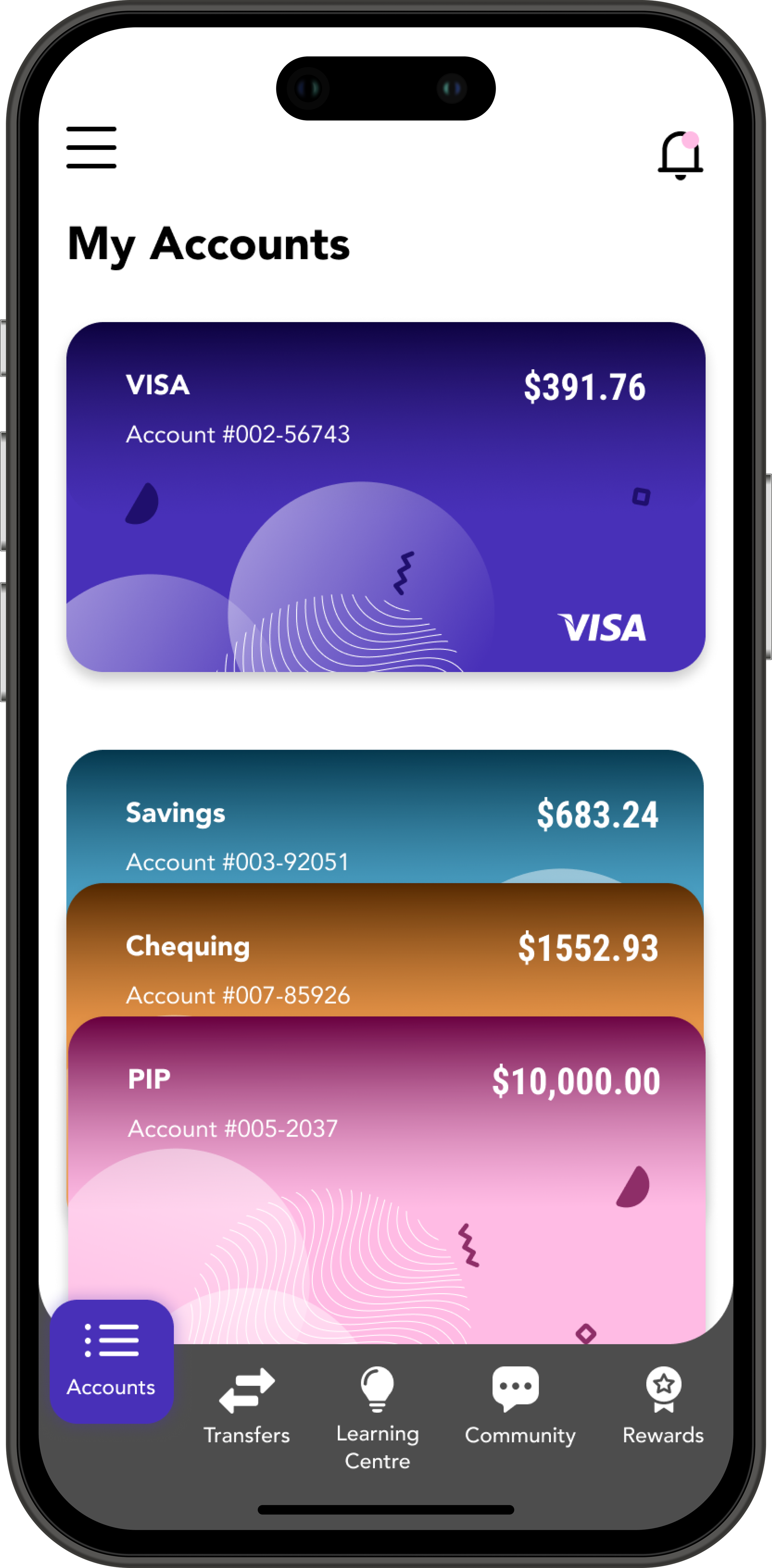 We presented our work to the executive team at Scotiabank Digital Factory and part of their feedback was that they loved our visual research but did not see it well represented in our designs. They suggested that we incorporate more of that fun, teen style into our designs while still maintaining a professional bank style. With that feedback in mind, I did a personal visual redesign of the project after the sprint.