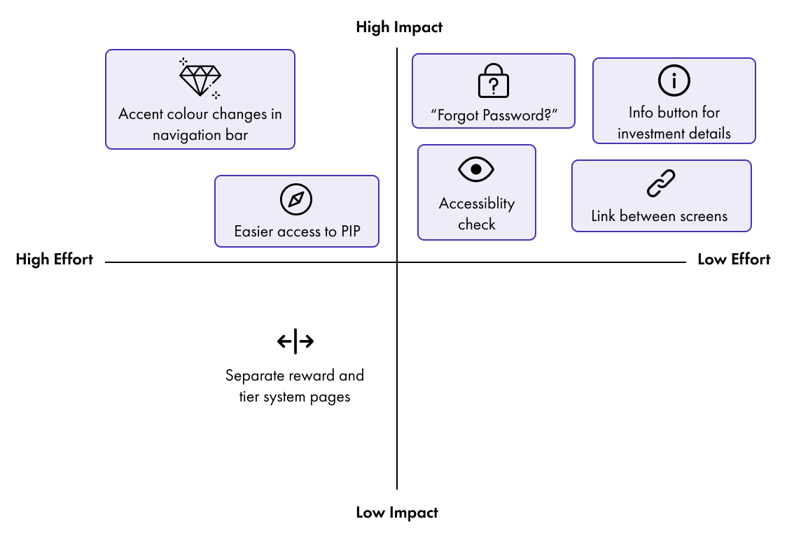 Based on user testing, we came up with a high impact low effort quadrant to identify important changes to make for our final product. Items boxed are the ones we proceeded to make changes for the final iteration: